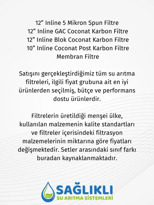 Set içerisinde yer alan 12” Inline 5 Mikron Spun (Sediment) Filtre, sudaki kum, tortu ve büyük partikülleri tutarak ön filtrasyon sağlar. 12” Inline GAC Coconat Karbon Filtre ve 12” Inline Blok Coconat Karbon Filtre, klor kaynaklı tat ve koku oluşumunu azaltmaya yardımcı olur.