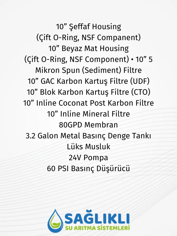 Sistemde yer alan 10” 5 mikron spun (sediment) filtre, sudaki tortu ve partikülleri etkili şekilde giderir. GAC karbon kartuş filtre (UDF) ve blok karbon kartuş filtre (CTO), klor, organik kirleticiler ve kötü kokuların arıtılmasını sağlar. Inline coconut post karbon filtre ve inline mineral filtre, son aşamada suyu zenginleştirerek içme suyu kalitesini artırır.