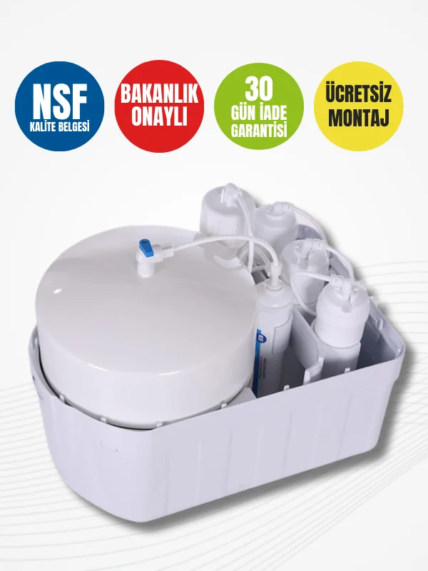 Lüks musluk ve shut-off valf, kullanım konforunu artırırken; opsiyonel olarak sunulan pompa (24V 1,5A adaptör ile) sayesinde su basıncı yükseltilerek daha verimli bir arıtma elde edilebilir. 60 PSI basınç düşürücü opsiyonu ise sistem basıncını dengede tutmaya yardımcı olur. Ayrıca şeffaf veya mat kapak renk seçenekleri, cihazın mutfak dekoruna uyum sağlamasını mümkün kılar.