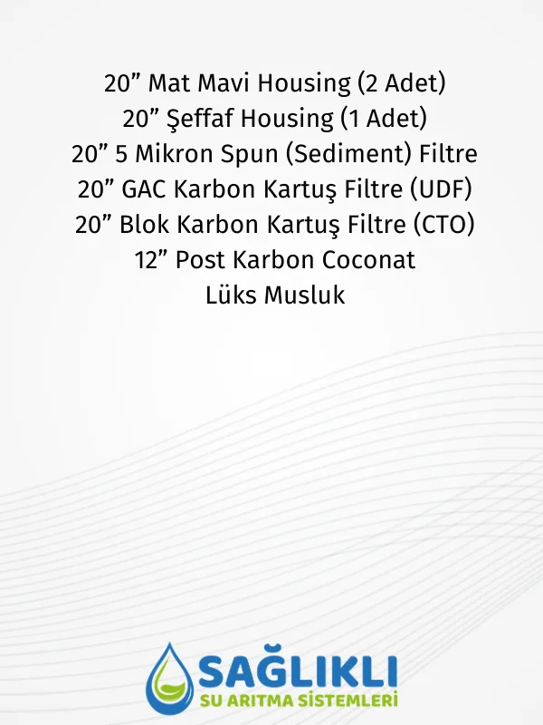 Sistemde yer alan 20″ mavi mat ve şeffaf housing yapıları, filtrasyon sürecinin sağlıklı şekilde ilerlemesine olanak tanır. 20″ 5 Mikron Spun (Sediment) filtre, sudaki tortu, kum ve kaba partikülleri etkili biçimde tutarak ilk aşamada suyu berraklaştırır. Ardından gelen GAC Karbon Kartuş (UDF) ve Blok Karbon Kartuş (CTO) filtreler, klor, organik kirleticiler ile tat ve kokuya neden olan maddeleri giderir.