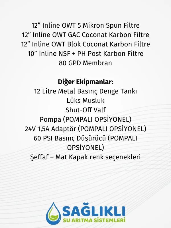 Sistemde yer alan 12 inç Inline OWT 5 mikron spun filtre, OWT GAC Coconut karbon filtre ve blok Coconut karbon filtre, sudaki tortu, klor ve zararlı maddeleri en ince partiküllere kadar arıtarak temizler. 10 inç Inline NSF + pH post karbon filtre, suya son aşamada denge kazandırarak pH seviyesini optimize eder. 80 GPD membran, yüksek arıtma performansı sunarken; 12 litrelik metal basınç denge tankı, temiz suyun her zaman hazır olmasını sağlar.